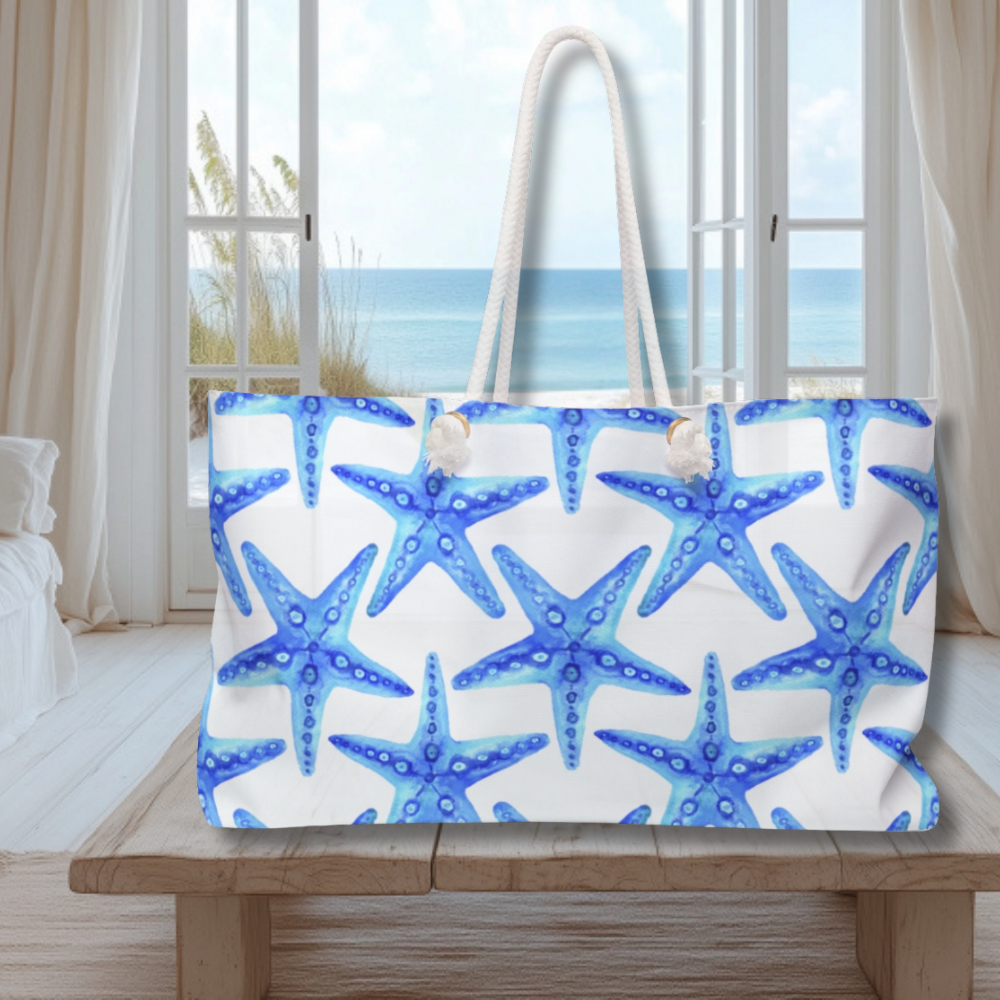 Our oversized Beach bag is perfect for your weekend at the beach or in town. The wide-mouthed, durable bag holds a generous amount of personal items and is easily held by its thick rope handles.