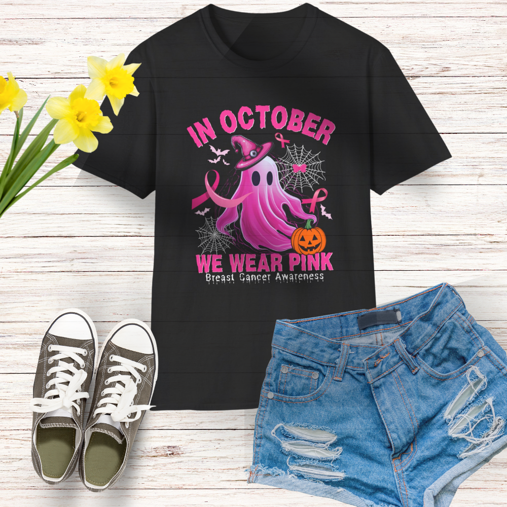 In October We Wear Pink T-Shirt – Breast Cancer Awareness Halloween Shirt