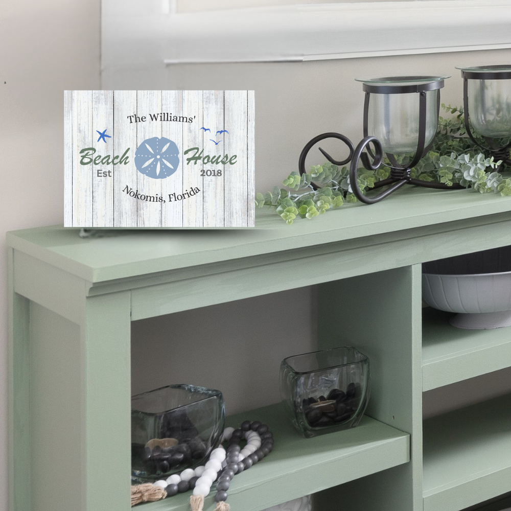 Bring coastal charm to your space with a personalized beach house sign featuring your family name, established year, and location. Designed with a rustic whitewashed wood background, starfish, sand dollar, and seagulls, this canvas makes the perfect coastal home décor piece or thoughtful gift for weddings, housewarmings, or vacation homes.
